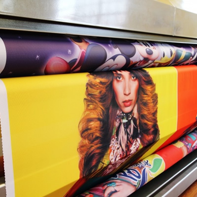 Impresión a color en tela por medio de sublimación. Uso para interiores con duración de 10 años y en exteriores de 8 meses. Ancho máximo 1.10m en una sola pieza. Impresiones más grandes se realizan en paneles que se unen mediante costura.