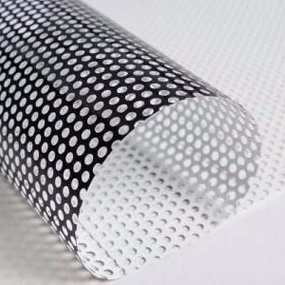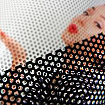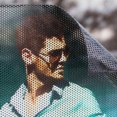 Impresión directa a todo color sobre vinil auto adherible perforado. Ancho máximo de 1.37 de una sola pieza. Se pueden unir paneles hasta el tamaño deseado. El perforado permite el paso de la luz y se ve de adentro hacia afuera.